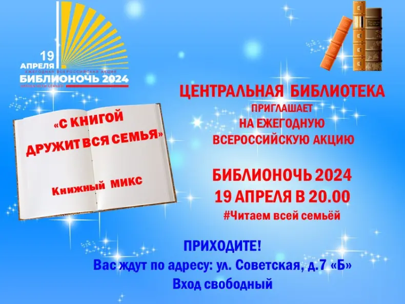 В рамках всероссийской ежегодной культурно-просветительской акции «Библионочь-2024» в библиотеке будет организован книжный микс «С книгой дружит вся семья». Акция «Библионочь» будет проходить по всей стране уже в 13 раз. Главным девизом встречи станут слова «Сплотить семью сумеет мудрость книг». В этот день гостями библиотеки станут семейные команды – активные, эрудированные, творческие, любящие книгу и чтение, для которых будет подготовлена насыщенная развлекательная программа. Участники смогут принять участие в конкурсных заданиях: «Визитная карточка», «СтихИя семьи», «Угадай писателя», «Литературный аукцион», «На театральных подмостках». Стоит отметить, что в рамках данного мероприятия можно не только весело провести время, но и получить много интересной и полезной информации. Ни одна «Библионочь» не обходится без выступления музыкальных коллективов. В этот теплый вечер прозвучат песни о семье, любви и уважении. Фотозона «Книга и Я» привлечёт внимание всех посетителей. «Библионочь 2024» станет ярким событием в жизни каждой семьи!